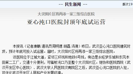大漢陽(yáng)片區(qū)將再添一家三級(jí)綜合醫(yī)院,亞心沌口醫(yī)院封頂年底試運(yùn)營(yíng)?。ㄝd《長(zhǎng)江日?qǐng)?bào)》2017年3月27日第九版) 鏈接:http://cjrb.cjn.cn/html/2017-03/27/content_5601713.htm?from=groupme